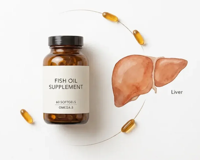 For fatty liver specifically, higher-dose EPA-dominant formulas typically in the range of 2,000-4,000 mg of EPA+DHA daily are commonly used in clinical settings. Choosing a verified high-purity fish oil in triglyceride form is crucial because the liver processes all absorbed substances.Fish oil supplement bottle next to a liver anatomy diagram representing omega-3 benefits for fatty liver disease